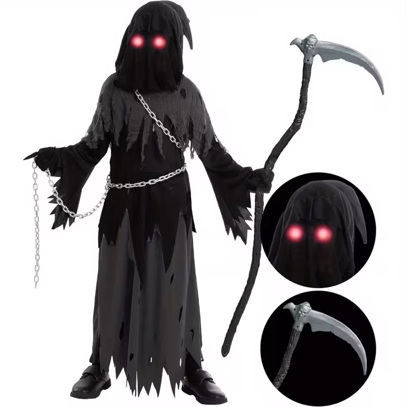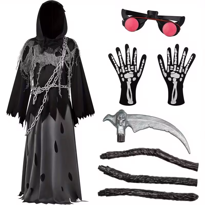 Grim Reaper ფორმა აქსესუარებით ბავშვებისთვის არის შთამბეჭდავი და იდუმალი კოსტუმი, რომელიც შესანიშნავია პატარა მოყვარულებისთვის, ვისაც სურს დაუვიწყარი ჰელოუინის ან სხვა თემატური ღონისძიების გამოცდილება. გრძელი შავი მოსასხამი და ფართო კაპიუშონი ქმნის საიდუმლოებით მოცულ იერსახეს, რომელიც განსაკუთრებულ შთაბეჭდილებას მოახდენს ნებისმიერ წვეულებაზე.