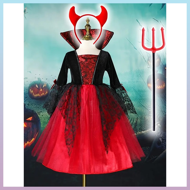 კომპლექტში შედის არა მხოლოდ კაბა, არამედ აქსესუარები – თმის დიადემა რქებით და სამკუთხედი სამკაული, რაც მთლიანად ამყარებს კოსტუმის იერსახეს. ასეთი კომბინაცია ბავშვს აძლევს შესაძლებლობას, რომ ჰელოუინზე ან სხვა თემატურ ზეიმზე ყველაზე ეფექტურად გამოიყურებოდეს.