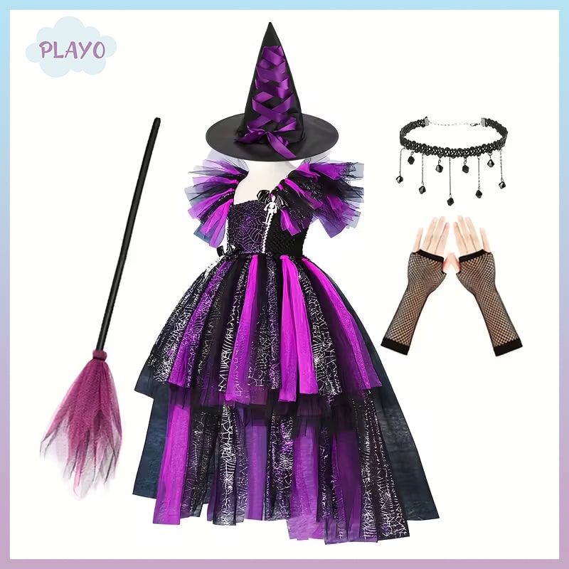 ჯადოქრის კაბა აქსესუარებით არის უნიკალური და ეფექტური კოსტუმი, რომელიც შექმნილია იმ ბავშვებისთვის, ვისაც უყვარს ჯადოსნური ისტორიები და ფანტაზიის სამყაროში მოგზაურობა. შავი და იისფერი ფერების ელეგანტური შერწყმა, მრავალფენიანი ქვედაბოლო და დეტალებში გაფორმებული ზედა ნაწილი ქმნის შთამბეჭდავ იერსახეს.