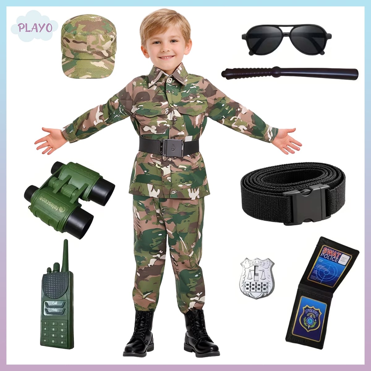ჯარისკაცის ფორმა ბავშვებისთვის არის განსაკუთრებული არჩევანი პატარებისთვის, რომლებიც გატაცებულნი არიან გმირებითა და თავგადასავლებით. კოსტუმი მოიცავს სამხედრო სტილის ქურთუკსა და შარვალს, რომელსაც აქვს რეალისტური კამუფლაჟის პრინტი. კომპლექტს თან ახლავს სხვადასხვა აქსესუარი – ქუდი, სათვალე, ბეიჯი, სათამაშო რაციები და ბინოკლი, რაც ბავშვს უფრო რეალურ სამხედრო გამოცდილებას აძლევს.