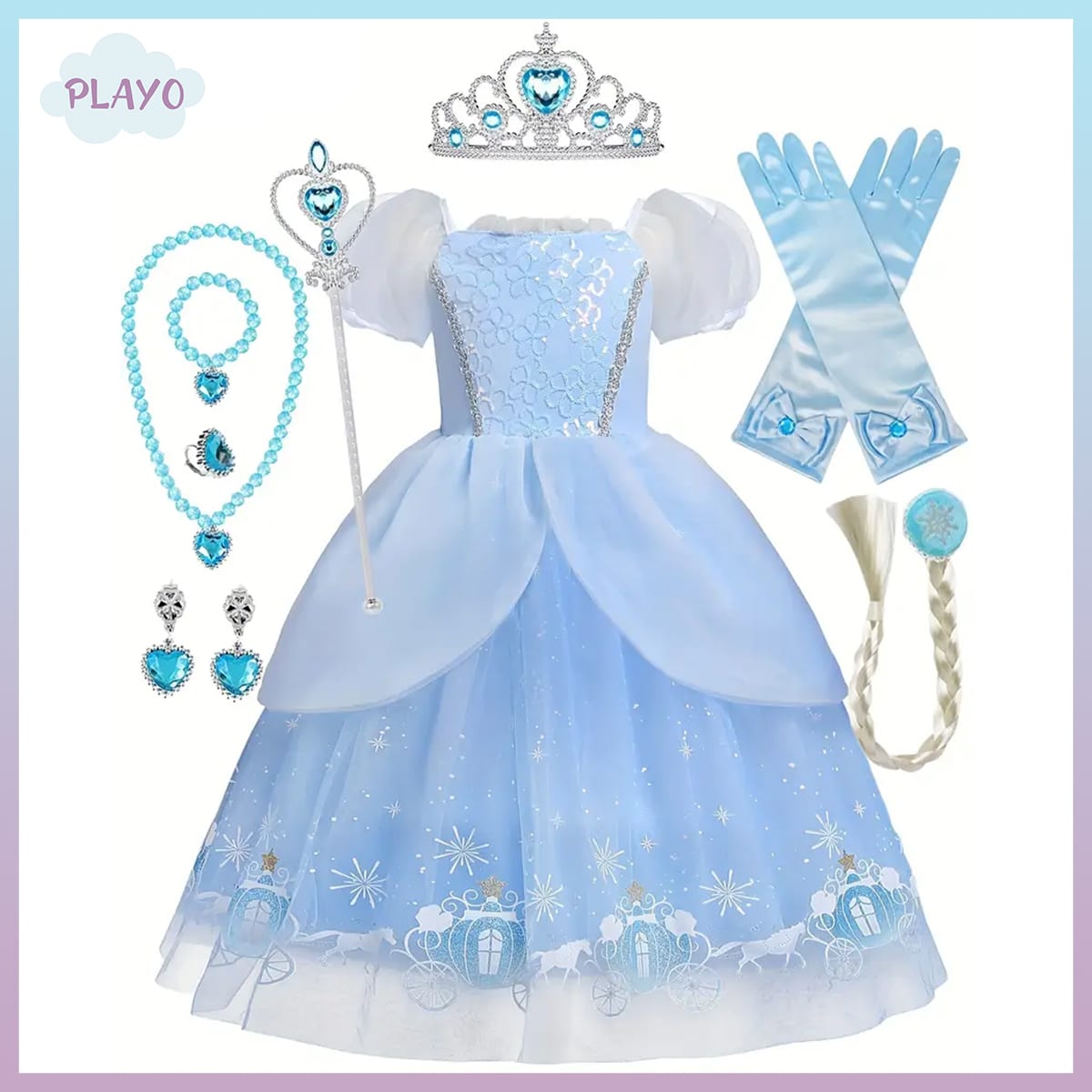კომპლექტში შედის ლამაზი კაბა, გვირგვინი, ჯადოსნური ჯოხი, ხელთათმანები, ყელსაბამი, საყურეები და თმის ნაწნავი