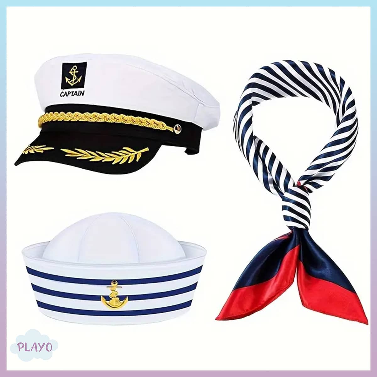 მეზღვაურის ქუდი და აქსესუარები — ელეგანტური ქუდი, კაპიტნის კეპი და შარფი ზღვის თემატური სტილით, შესაფერისი როლური თამაშებისთვის და დღესასწაულებისთვის.