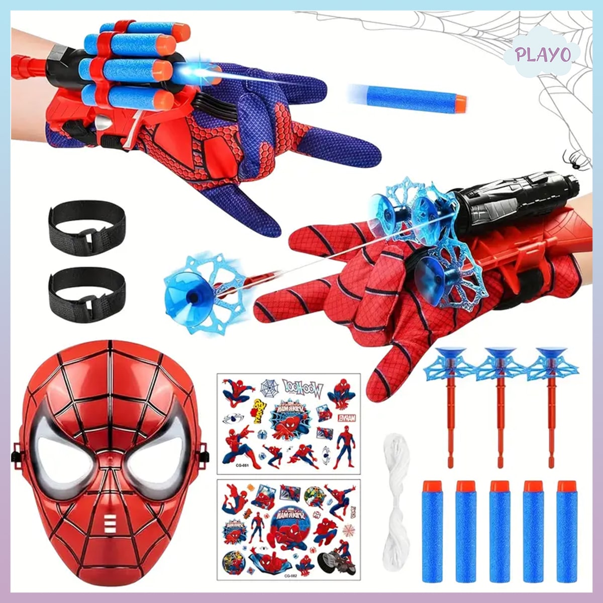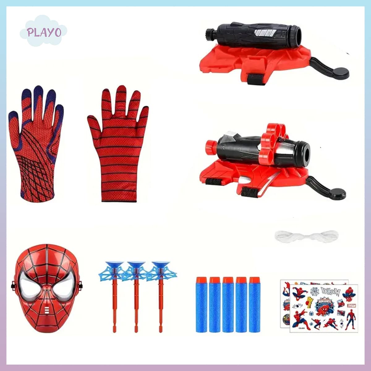 - შემადგენლობაშია: ნიღაბი, ორი ცალი ხელთათმანი, ორი სხვადასხვა ტიპის სასროლი აქსესუარები, სპაიდერმენის ქსელი და სტიკერები