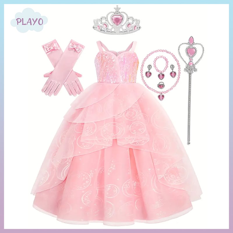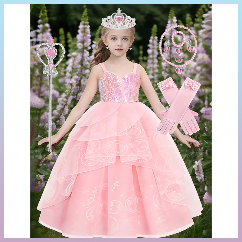 ვარდისფერი სადღესასწაულო კაბა – აქსესუარებით სრული კომპლექტი. დამზადებულია ხარისხიანი და უსაფრთხო ქსოვილისგან. შესაფერისია ზეიმებზე, ჰელოუინზე, ფოტოსესიებზე და როლური თამაშებისთვის.